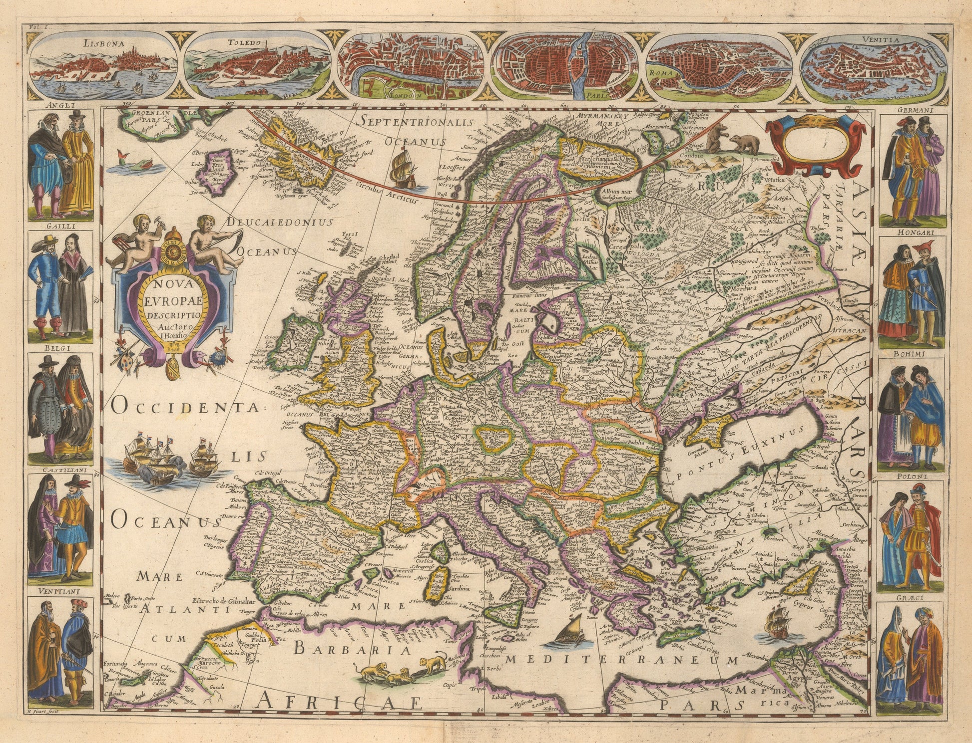 The map shows in detail the geo-political landscape of early 17th century Europe and extend far enough to include the northern coast of Africa, the Holy Land, Asia Minor, Russian Europe, Iceland, part of Greenland, and the mythical island of Frisland.
