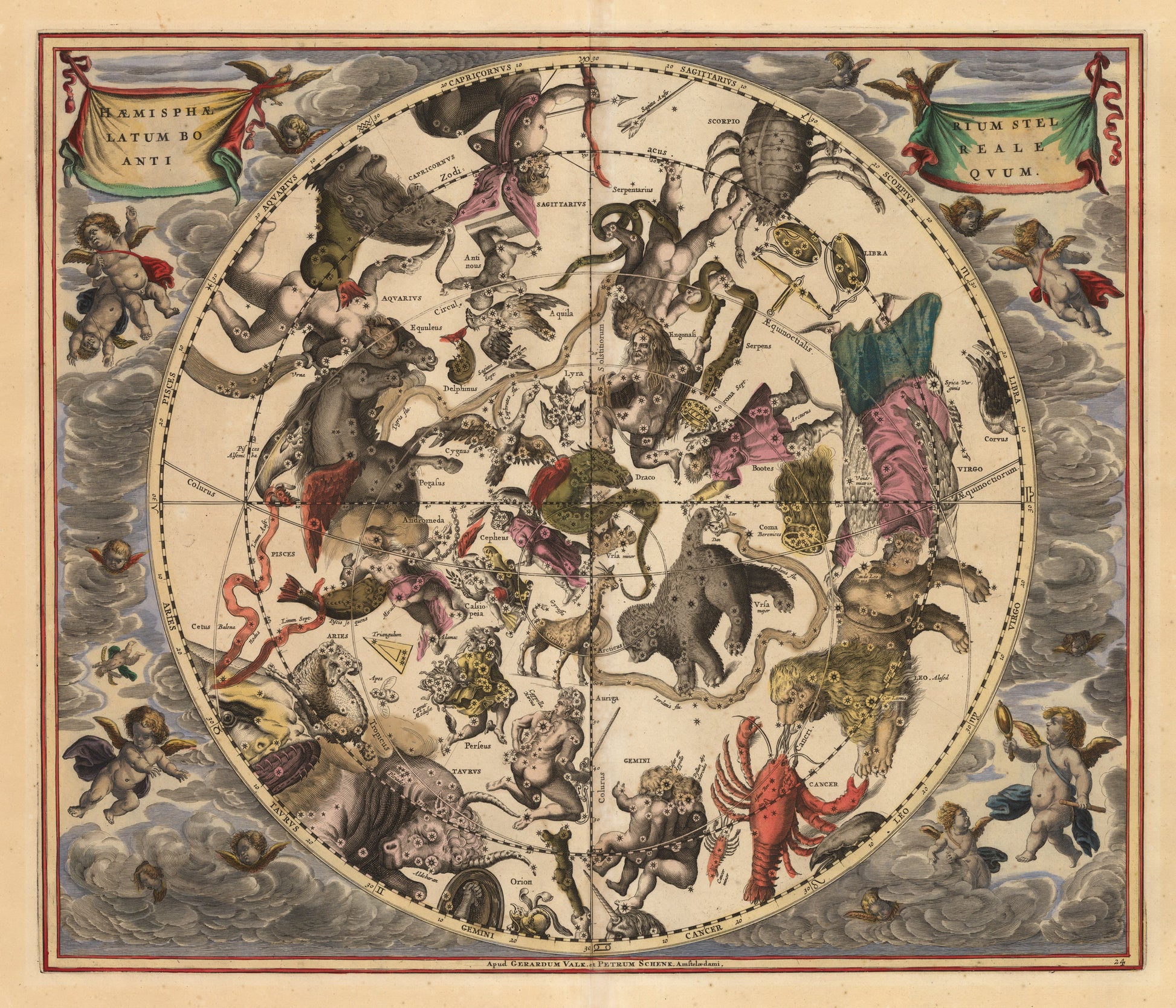 A fine print reproduction of a celestial chart by Andreas Cellarius, depicting the constellations of the Northern Sky as viewed from Earth. This chart reflects the theory from classical astronomy that all the stars and planets revolved in a huge sphere around Earth. Shows figures from the zodiac, as well as other fantastical animals and beasts in striking color engravings. Andreas Cellarius was a well-known celestial cartographer of the late 17th and early 18th centuries.
