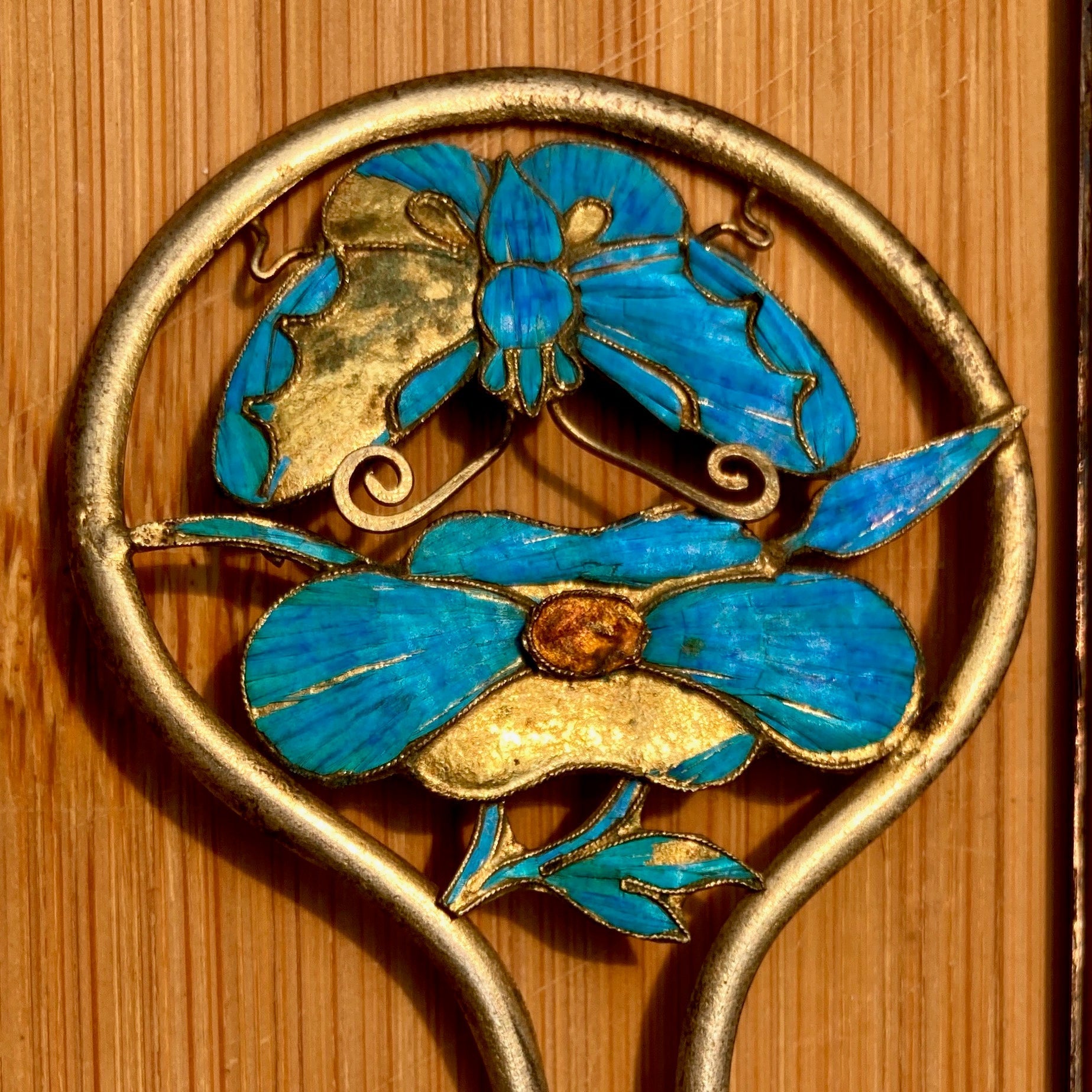 Hair pin featuring a butterfly, tian-tsui feathering is about 80% intact. Measures 4 tall.