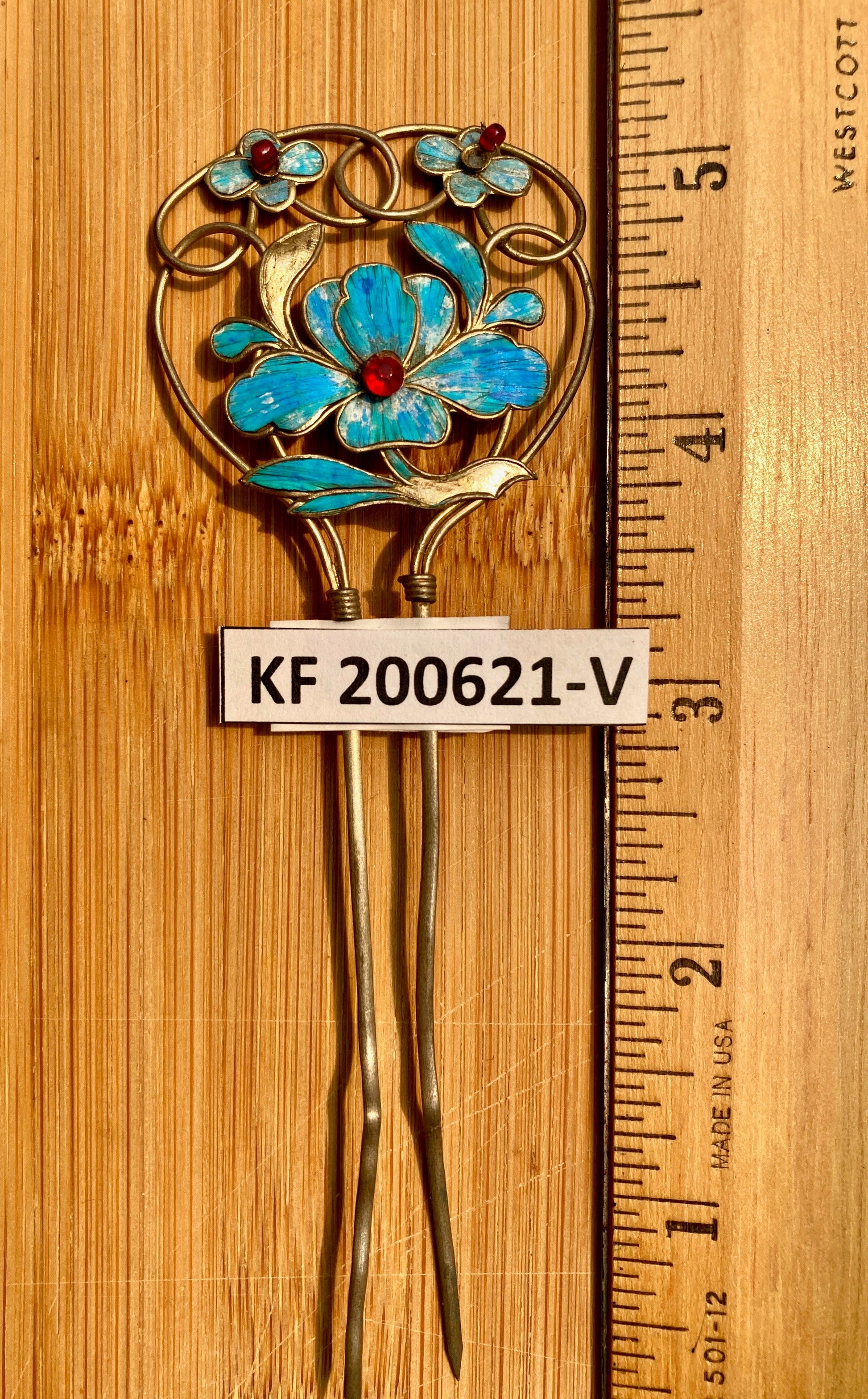 Hair pin featuring flower motif and three red glass beads. Feathering is about 75% intact. About 5 1/4 tall.